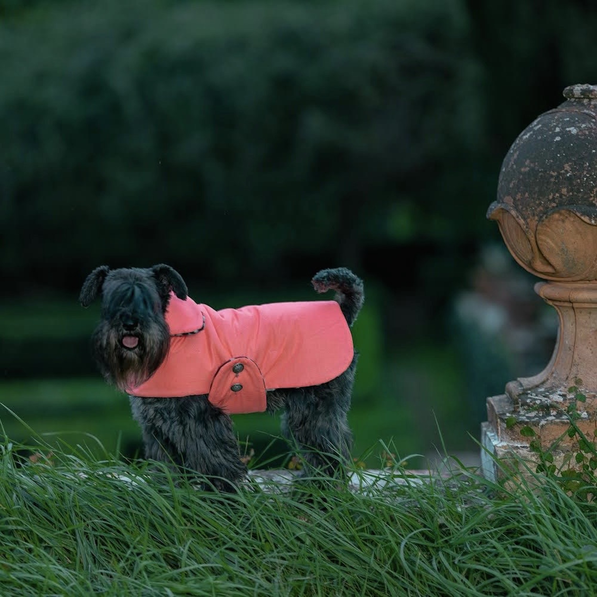 Studio 54 is handcrafted and bespoke with a black boiled wool fabric with a white pattern on one side and a fluorescent pink waterproof fabric on the other. The internal padding is made of ultra-light professional technical fiber for exceptional thermal insulation and perfect breathability. It has never been easier to let your four-legged friend wear a garment: the convenient and fast closing system uses metal jewel buttons. The function of the bellyband is to defend the abdomen from cold and splashes of rain.