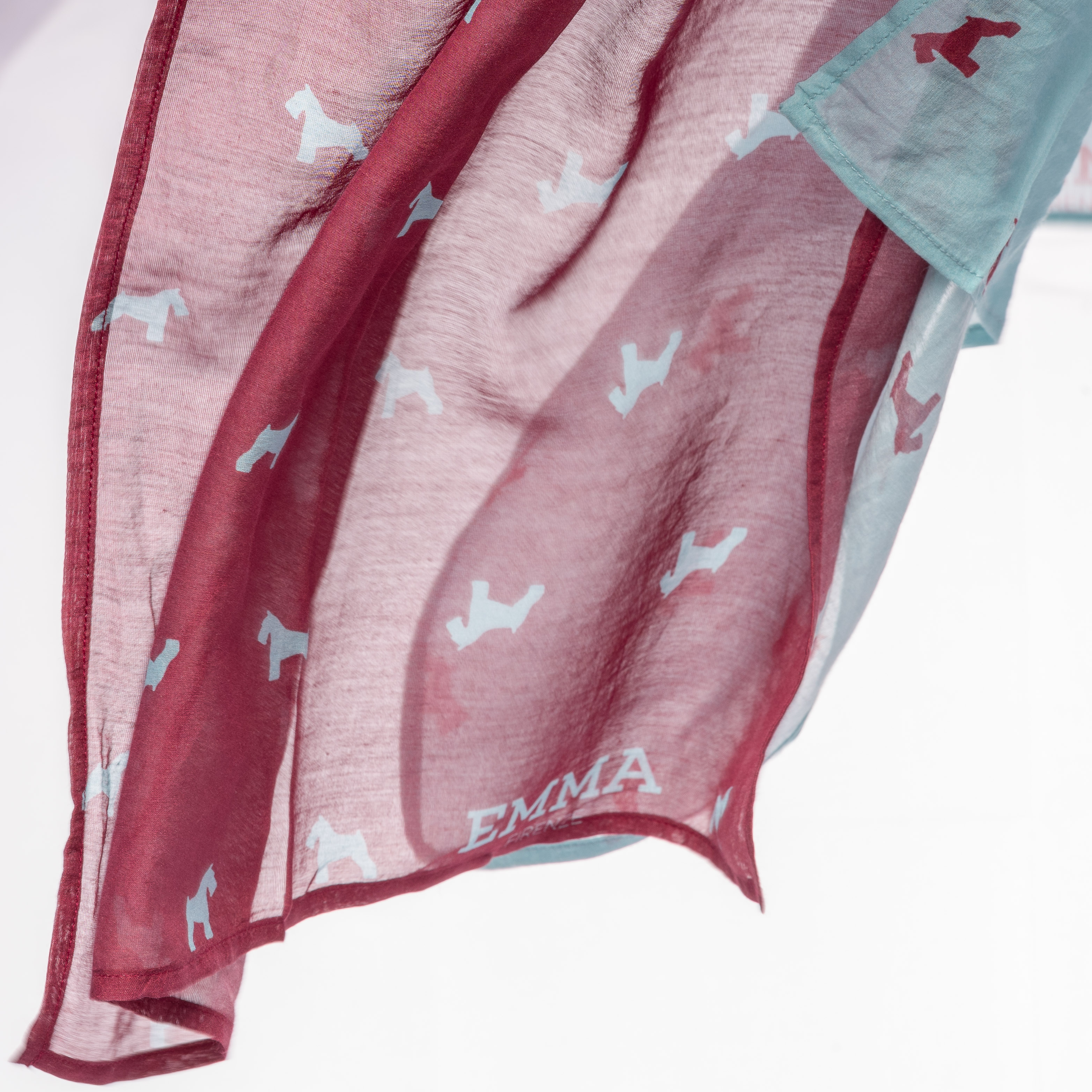 WINE RED-CLOUD, foulard per cani in georgette di seta e cotone rosso vino stampato con l’inconfondibile motivo ‘Schnauzer’ di EMMA Firenze in azzurro cielo e bordato a mano. Caratterizzato da una impalpabile leggerezza, ha una dimensione che gli consente di essere utilizzato in vari modi.