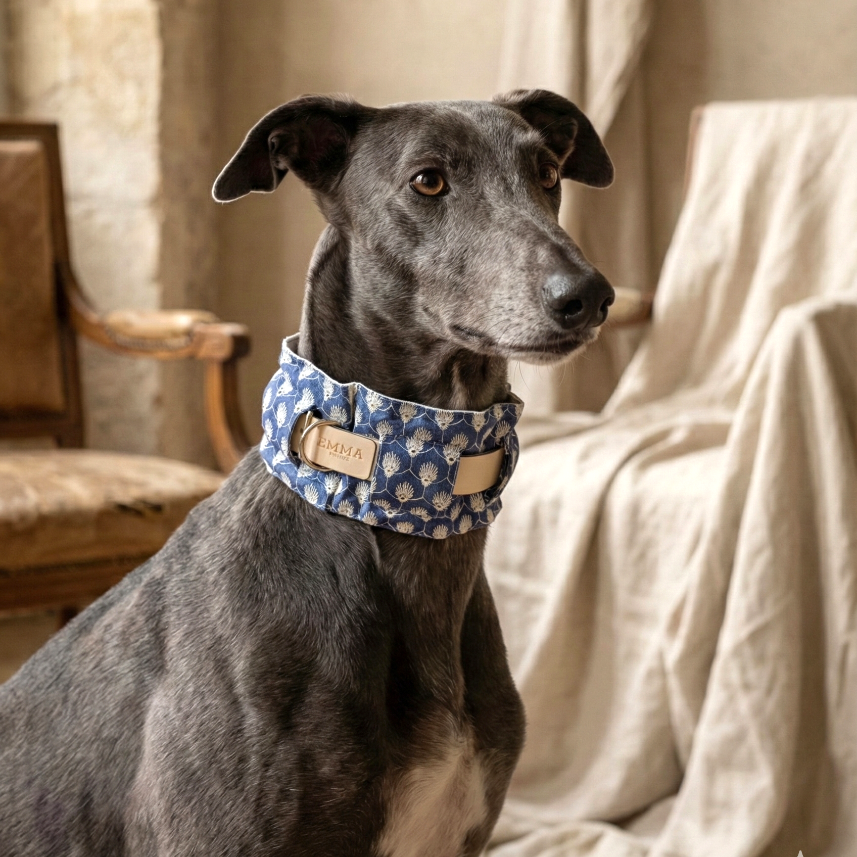 Disponibile in 3 taglie con altezze diverse:COURTLY GREYHOUND-COLLAR, collare per levrieri sofisticato realizzato in morbidissimo cavallino* color cammello e soffice vitello bianco avorio con accessori in ottone pieno con galvanica in nichel lucido a telaio, la più pregiata.